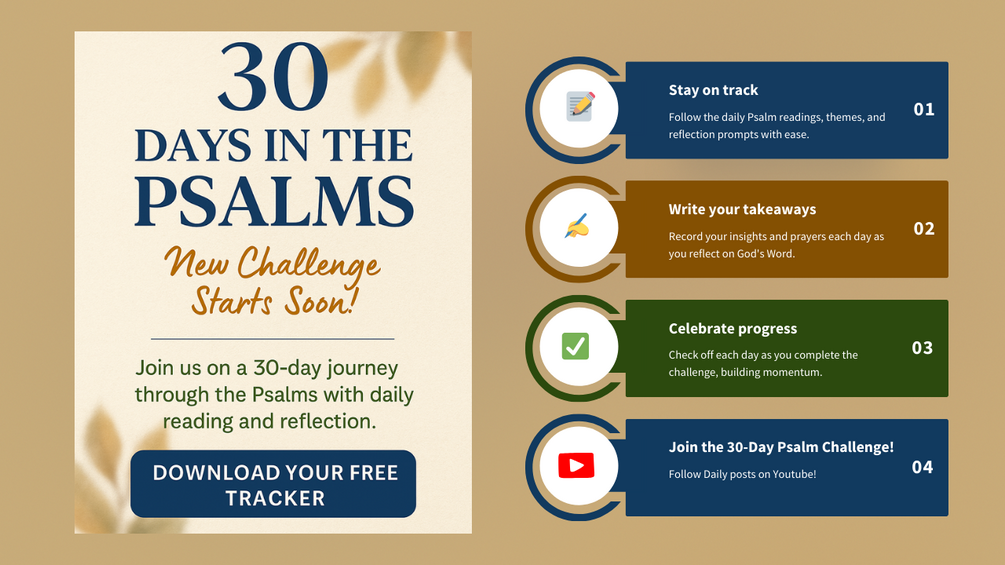 Start your journey through the Psalms with this beautifully designed, printable 30-Day Tracker. Whether you're seeking spiritual growth, deeper reflection, or a stronger connection with God, this challenge will guide you through a month of inspired worship, prayer, and devotion.